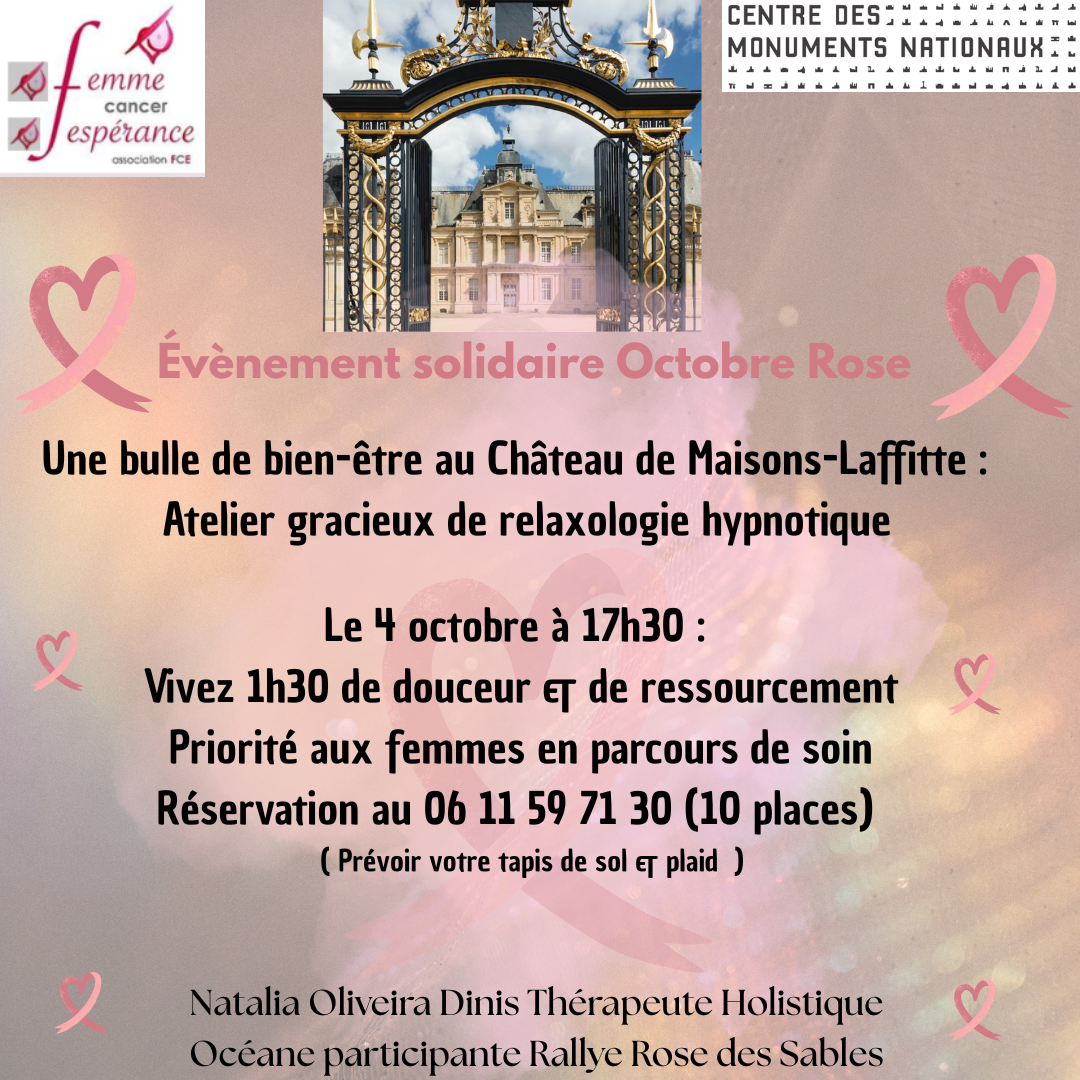 un atelier gracieux de relaxologie hypnotique, en priorité dédié aux femmes en parcours de soin ou l'ayant traversé .