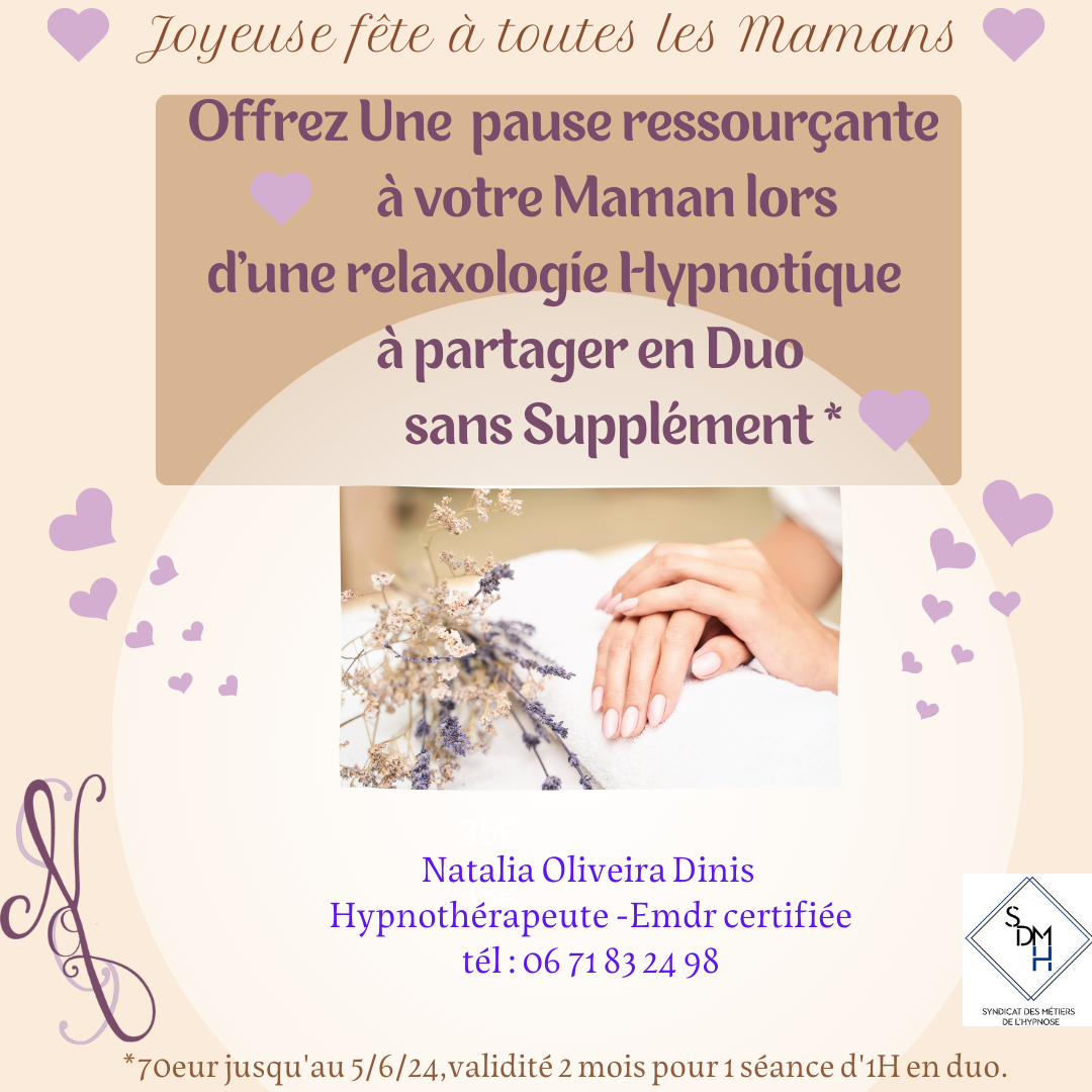 Parcequ’une Maman est toujours prête à faire mille & une chose pour notre plus grand Bonheur…profitez de la fête des mamans pour lui offrir une pause durant laquelle sa seule chose à faire est se détendre et se ressourcer. Et comme le bonheur se partage , votre maman peut profiter de cette relaxologie hypnotique avec la personne de son choix sans supplément ( 70 euros 1H en Duo , achat jusqu’au 5/6/24, valable 2 mois ).