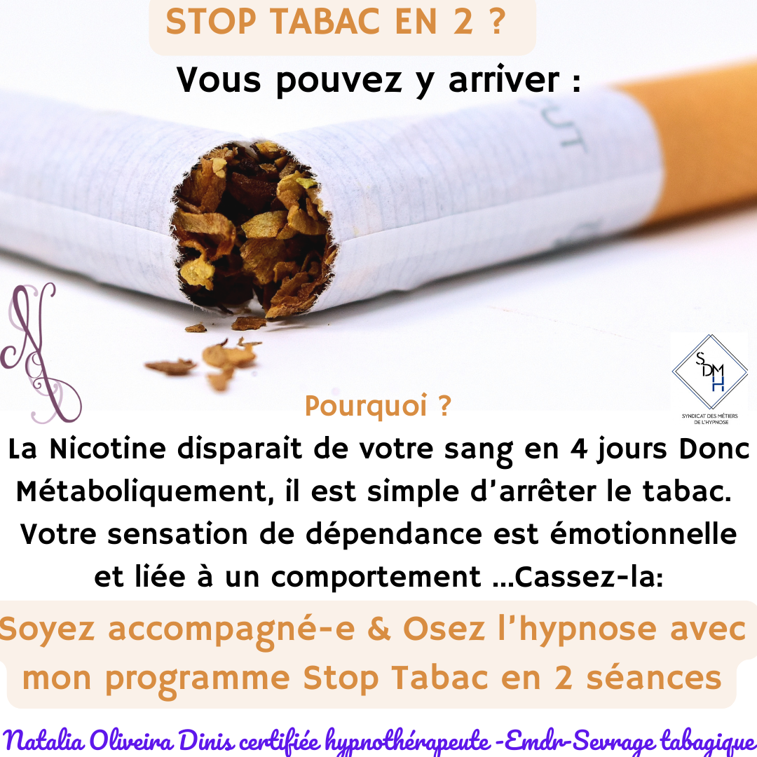 Certifiée en Hypnose ,Emdr ,Neurosciences & Sevrage tabagique ,je propose un programme stop Tabac en 2 séances basée sur une combinaison de PNL (ou programmation neurolinguistique) et d’hypnose thérapeutique .C’est cette combinaison et ma transmission d’outils simples qui accroîssent l’efficacité de l’hypnose dans votre Décision & Motivation d’arrêt du Tabac à Vie .